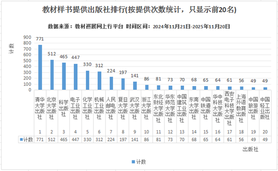截止到11月20日18時(shí)(時(shí)間區(qū)間:2024年11月21日0時(shí)-2025年11月20日18時(shí))訪問/展示數(shù)據(jù): 教材巡展網(wǎng)上行平臺頁面訪問數(shù)(PV):684370次 IP訪問數(shù):392490次 參會(huì)出版社參展品種:405133種 可贈(zèng)送教材樣書品種:230532種