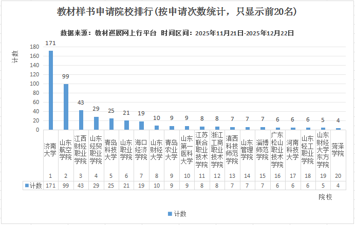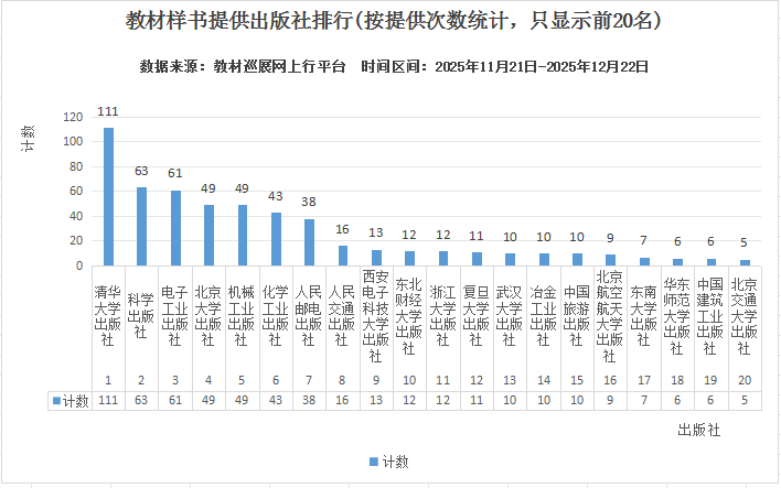 2025年11月21日,“2026全國教材巡展網(wǎng)上行”正式拉開帷幕。 本活動依托于“教材巡展網(wǎng)上行”(www.jcxzwsx.com)服務(wù)平臺,聯(lián)合科學(xué)出版社、清華大學(xué)出版社、北京大學(xué)出版社、電子工業(yè)出版社、化學(xué)工業(yè)出版社、機械工業(yè)出版社、人民郵電出版社、人民交通出版社、上海外語教育出版社、外語教學(xué)與研究出版社、中國建筑工業(yè)出版社、國防工業(yè)出版社等170家以教材出版為主的出版社,并得到了學(xué)校教材管理服務(wù)部門的大力支持,打造出一條連接出版社和各學(xué)科任課老師的教材信息交流通道,為各學(xué)科任課老師的教材選用、教材樣書免費申請、自編教材的出版等方面提供優(yōu)質(zhì)的服務(wù)。 為了滿足學(xué)校和出版社的要求,從2025年11月21日開始我們定時播報教材巡展網(wǎng)上行的各類數(shù)據(jù)統(tǒng)計,并保證數(shù)據(jù)的真實性和有效性。 截止到2025年12月22日8時(統(tǒng)計區(qū)間:2025年11月21日0時-2025年12月22日8時) 訪問/展示數(shù)據(jù):