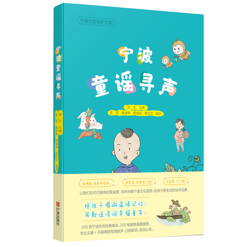 寧波童謠尋聲 掃碼即聽,音動心弦。200首寧波傳世童謠,200幅童真童趣插畫。 本書為以寧波話編寫的童謠集,讀者對象為少年兒童。本書以原寧波出版社出版的《寧波童謠》為參考文本,書中選編的篇目均為在寧波地區(qū)世世代代為人所傳誦的童謠,朗朗上口,韻律十足。其中包含貼近生活的、親切有趣的場景,如喂飯、催眠、談天氣、逗小動物等,處處妙趣橫生。 《寧波童謠尋聲》編著團隊由寧波市社科聯(lián)(市社科院)專家、寧波音樂廣播制播團隊、《寧波童謠》編者和寧波工程學院插圖團隊組成。本作品包括書稿和每首童謠對應的音頻二維碼。書稿共200首童謠,200張插圖。書中插圖由寧波工程學院人文與藝術學院師生共同繪制而成。本書在《寧波童謠》的基礎上編輯更新并有聲化錄制,將有聲音頻轉化文本書稿,書稿中附有音頻二維碼便于對照傳播。 此書的出版通過系統(tǒng)化梳理和語音轉化,對寧波方言語音進行搶救性保護,既留存寧波方言精確的語音面貌,更是對寧波鄉(xiāng)土韻味和地方文化的傳承、傳播。