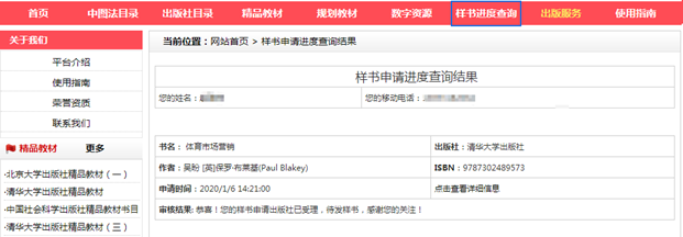 輸入個(gè)人信息,點(diǎn)擊查詢后,可以看到當(dāng)前申請(qǐng)樣書的進(jìn)度情況。如下圖: